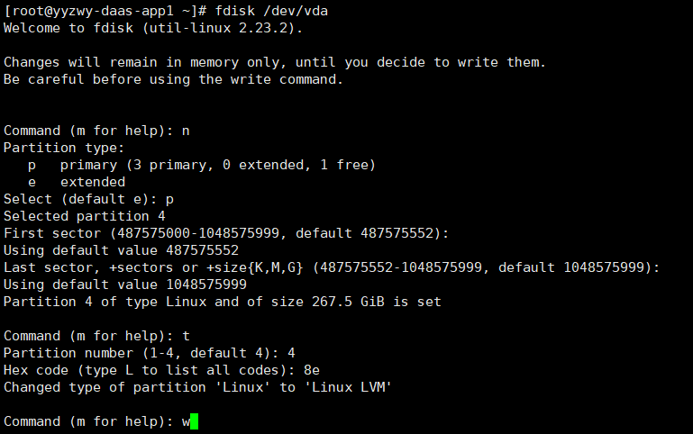 依次输入:n (创建一个分区) ---> p (主分区) ----> First ...(输入新增卷在磁盘的起始位置,可以使用默认值,直接回车),Last ...(输入磁盘新增卷在磁盘的结束位置,这里最好填写实际需求大小,也可以直接回车使用默认值) ---> t(更改分区类型)---> 8e(LVM类型) ---> w(保存操作并退出fdisk)