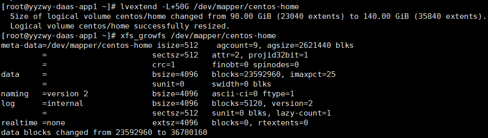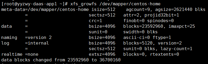 /home目录的分区文件系统类型为 xfs ,所以使用 xfs_growfs 命令对文件系统进行扩展:xfs_growfs /dev/mapper/centos-home