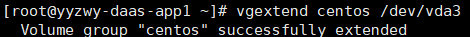 将新增卷划分给 /home目录所在VG组:vgextend centos /dev/vda3