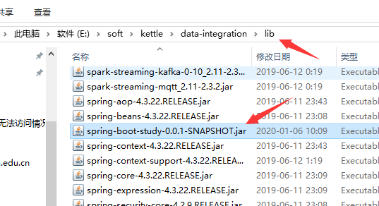 工具类方法开发完毕后,可通过 mvn clean package -DskipTests 命令进行打包,在 target 目录下,会生成一个 jar 文件。需要将这个 jar 包放到 kettle 的 lib 目录下。如下图所示: