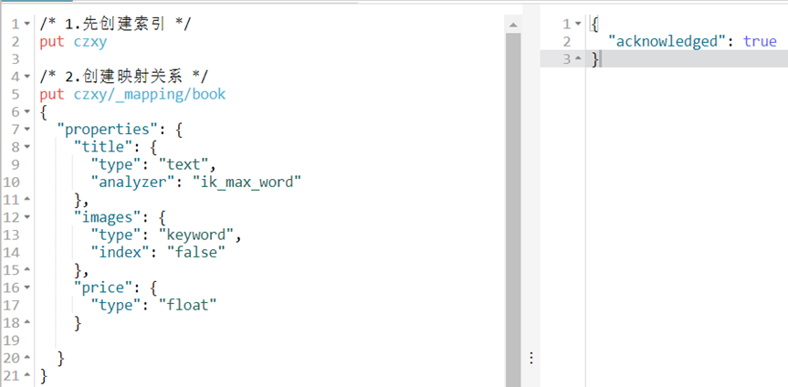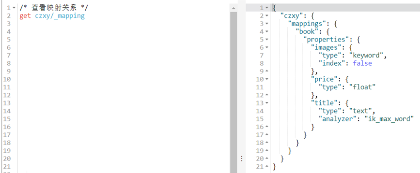 - 映射配置(mappings):字段的数据类型、属性、是否索引、是否存储等特性。
