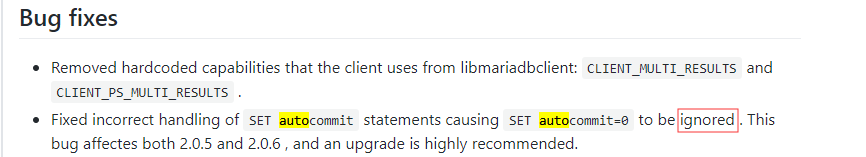 接着找到DBA,发现测试环境mysql外新加了层proxysql,那可能是这个的问题哦,于是又一通查,发现proxysql会接收set autocommit=0的命令,但不会送到后端的mysql,就在穷途末路时,去看了下版本的changelog,发现有这样一句描述,丫会忽略set autocommit=0,导致事务根本就没开启,FUCK。