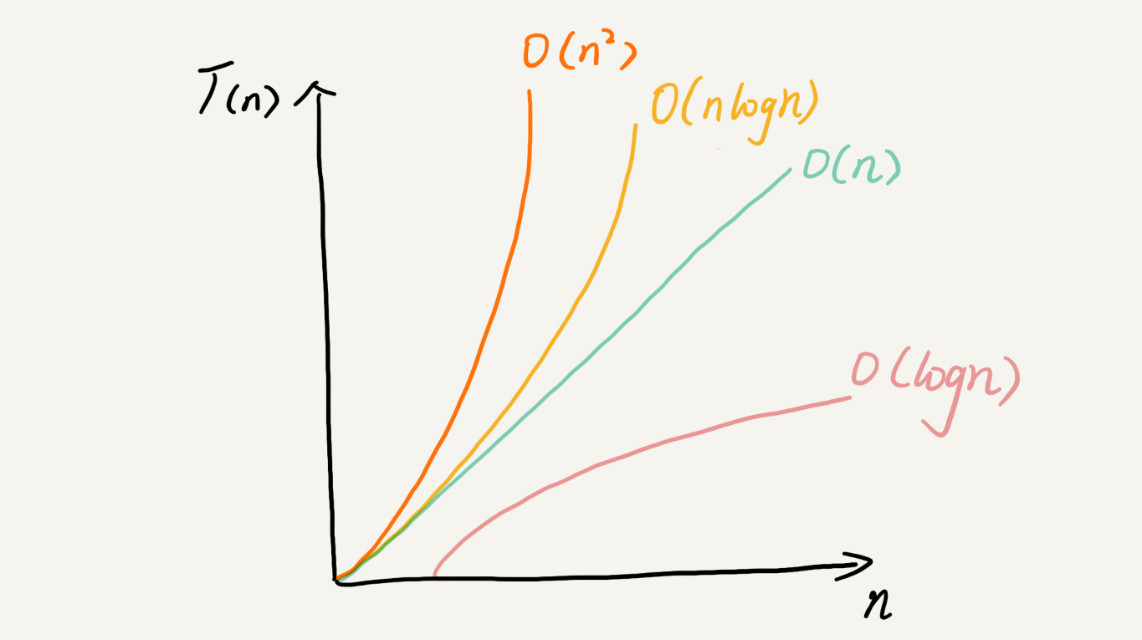 这里我们引入的是大O表示法,T(n)=O(f(n)),其中,T(n) 表示代码执行的时间;n 表示数据规模的大小;f(n) 表示每行代码执行的次数总和。因为这是一个公式,所以用 f(n) 来表示。公式中的 O,表示代码的执行时间 T(n) 与 f(n) 表达式成正比。