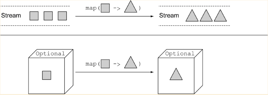 从概念上,这与我们之前看到的流的map方法相差无几。map操作会将提供的函数应用于流的每个元素。可以把Optional对象看成一种特殊的集合数据,它至多包含一个元素。如果Optional包含一个值,那函数就将该值作为参数传递给map,对该值进行转换。如果Optional为空,就什么也不做。下图对这种相似性进行了说明,展示了把一个将正方形转换为三角形的函数,分别传递给正方形和Optional正方形流的map方法之后的结果。