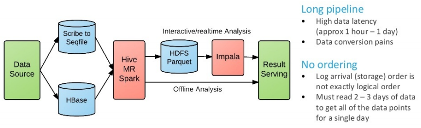 这是典型的Lambda架构(存在两套相对独立的数据流水线:批处理和流处理),一部分源系统数据是通过Scribe(日志聚合系统)把数据写到HDFS,另一部分源系统数据(实时性要求较高的?)是直接写入HBase,然后: