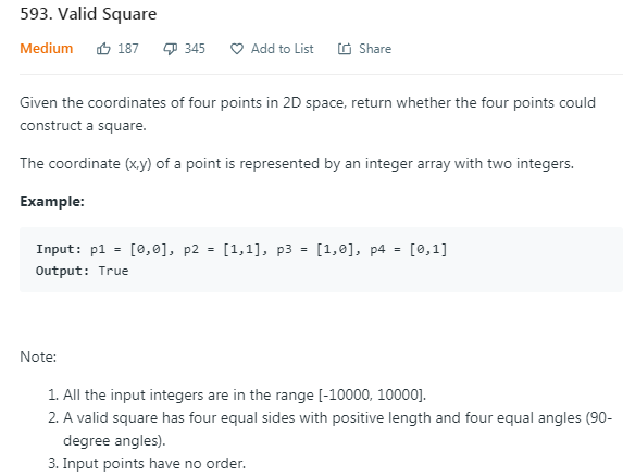 其实,我刚开始考虑复杂啦,参考@Grandyang的思路。细想一下,点的位置确不确定并不会影响我们判断正方形,我们只需要知道四条边的长度和两条对角线的长度即可。 所以,可以计算出这四条边的长度和对角线的长度,然后利用set集合去重复性的特性,判断最后是否只有两个元素即可,只需注意有重合点存在(不存在0)。