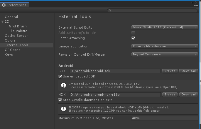 打开工程之后,需要在Edit->Preferences->External Tools界面设置好Android SDK,JDK,和NDK: