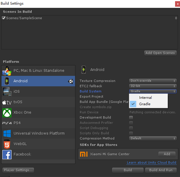 在生成apk的时候,unity提供了两种方式,Gradle和Internal,unity建议使用Gradle