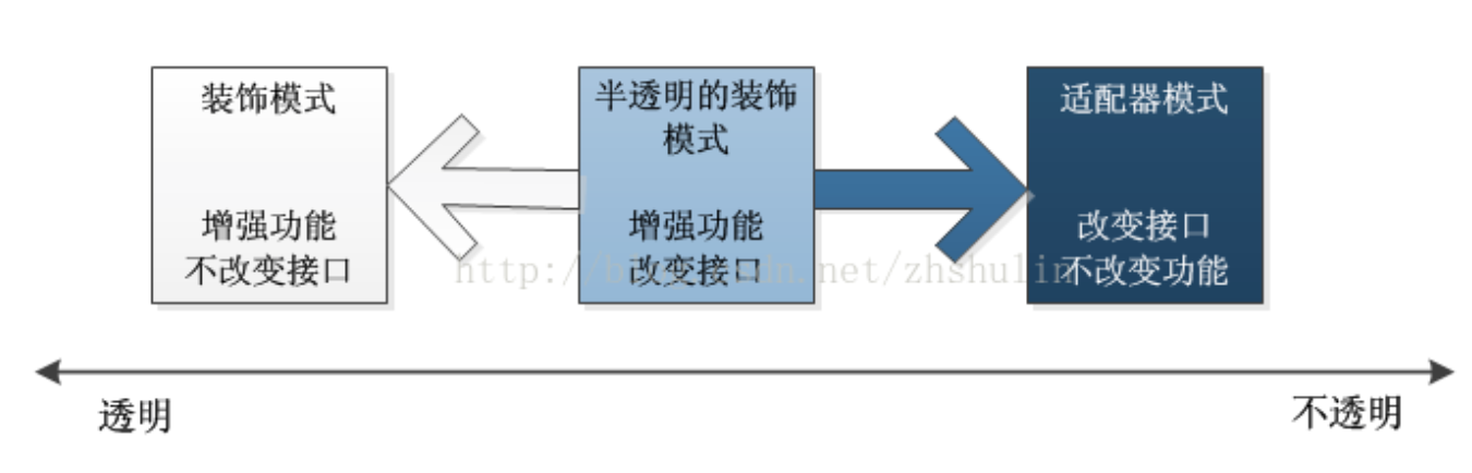 2、半透明装饰模式:装饰角色接口与抽象构件角色的接口不完全一致,装饰角色实际上已经成了一个适配器角色;