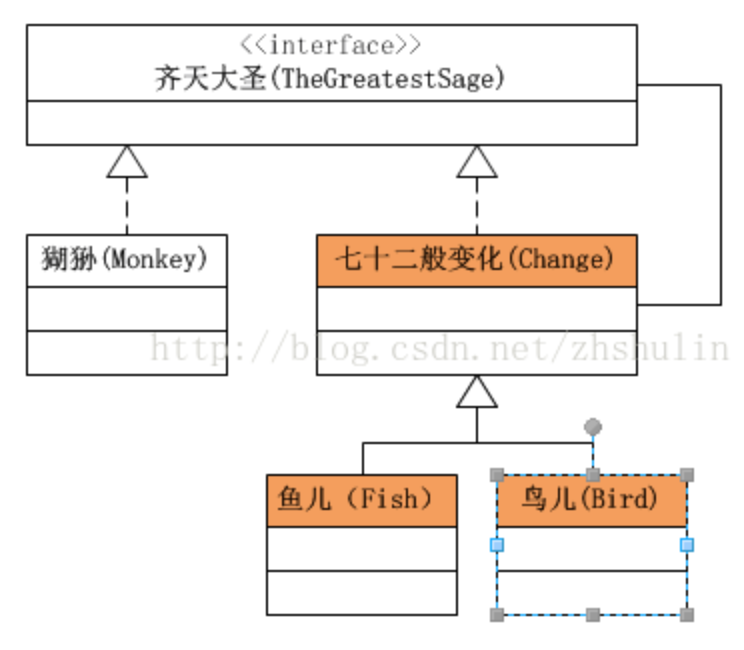装饰模式的用意是在不改变接口的前提下,增强所考虑的类的性能。在增强性能的时候,往往需要建立新的公开的方法。即便是在孙大圣的系统(如下图)里,也需要新的方法。比如齐天大圣类并没有飞行的能力,而鸟儿有。这就意味着鸟儿应当有一个新的fly()方法。