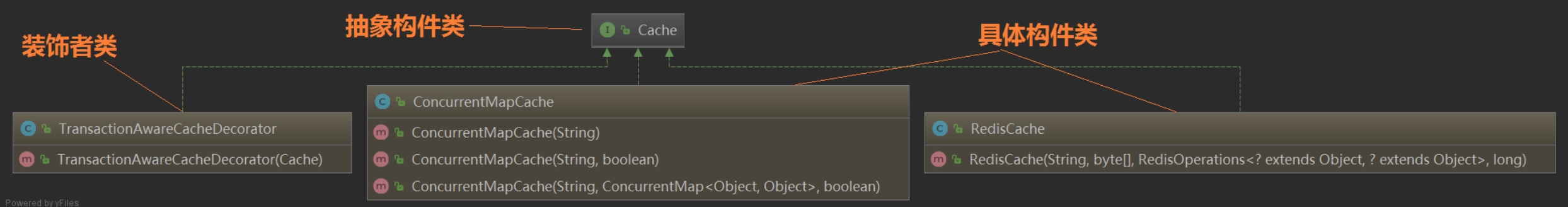 该类实现了 Cache 接口,同时将 Cache 组合到类中成为了成员属性 targetCache,所以可以大胆猜测 TransactionAwareCacheDecorator 是一个装饰类。
