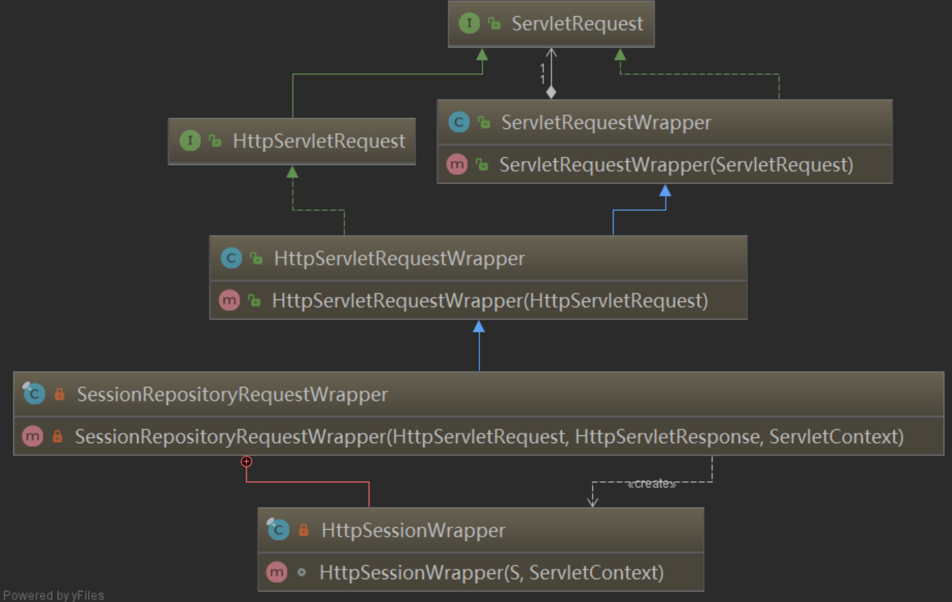 可以看到该类对 ServletRequest 进行了包装,这里是一个装饰者模式,再看下图,spring session 中 SessionRepositoryFilter 的一个内部类 SessionRepositoryRequestWrapper 与 ServletRequestWrapper 的关系。
