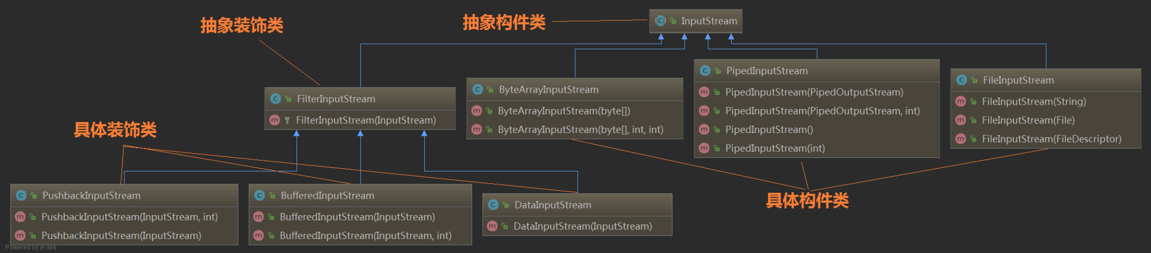 由上图可以看出只要继承了FilterInputStream的类就是装饰者类,可以用于包装其他的流,装饰者类还可以对装饰者和类进行再包装。