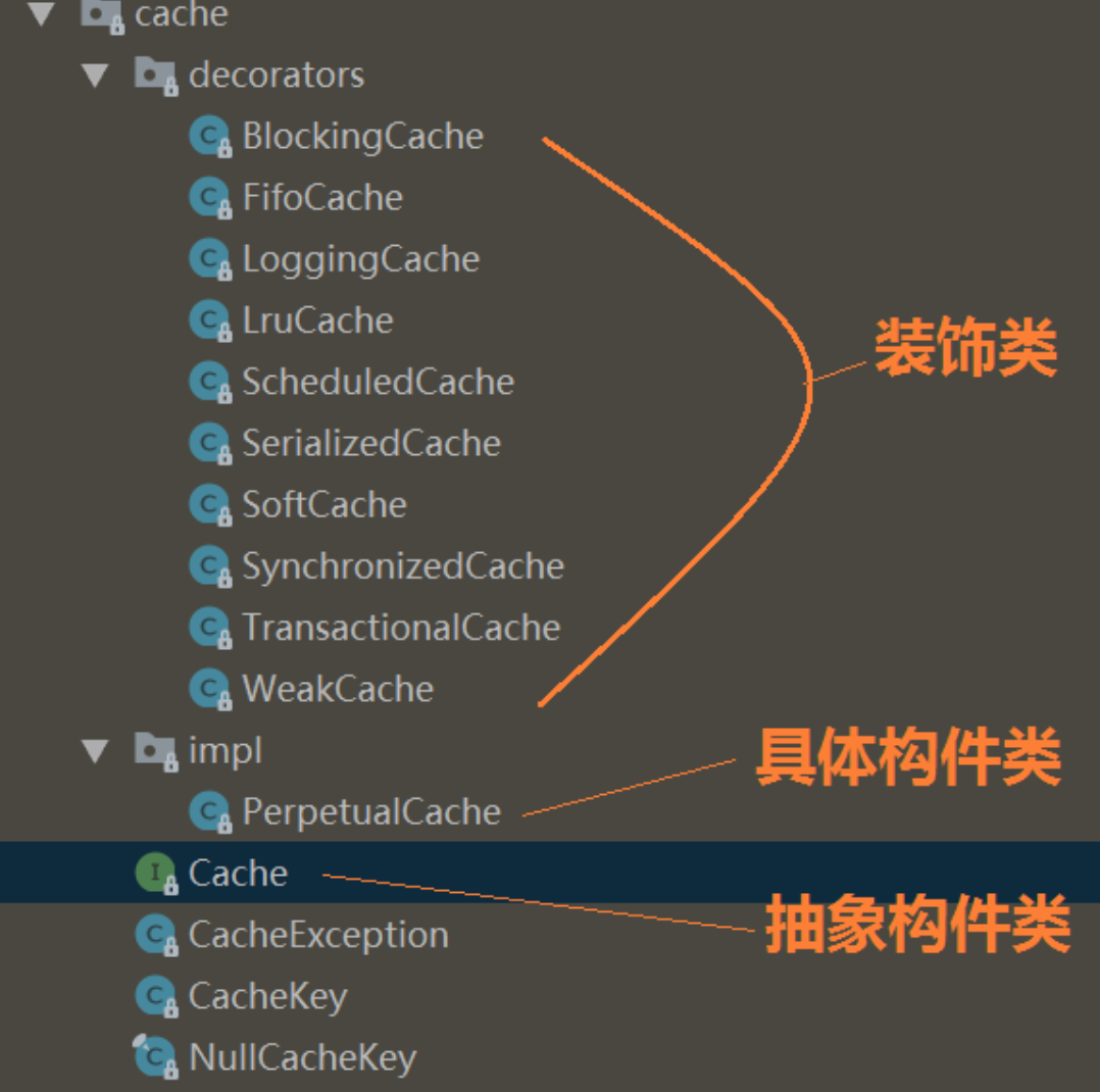 Cache 为抽象构件类,PerpetualCache 为具体构件类,decorators 包下的类为装饰类,没有抽象装饰类;