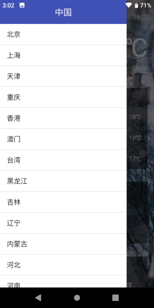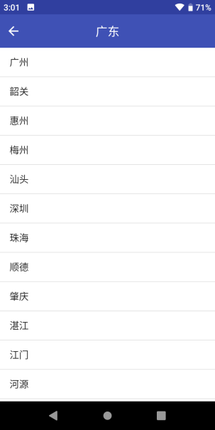 App介绍:首次启动应用时列表显示全国34个省份及直辖市包括港澳台,如果选择省份进入所在省份下的市列表,如果再选择市项进入该市下所有的区或县(包括该市)列表,如果再选择该列表下的项就显示该区域的天气预报界面。图5从左滑出侧边栏可以选择其他城市。如果是非首次启动,则显示上次选择的城市天气预报界面(比如退出时显示广州的天气预报界面即图4,再次进入时仍显示该界面)。
