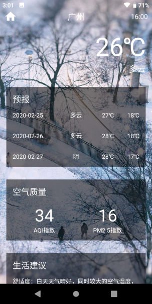 以上就是整个app的具体介绍,具体思路大概是先通过DataSupport获取远程服务器上的城市列表,然后通过和风天气平台获取选中的城市天气预报及空气质量指数等。