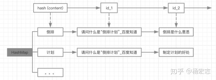 根据业务需要,对内容选择适当的 hash 规则。将站内所有的内容,组织成的大的 HashMap 即为「倒排索引系统」。