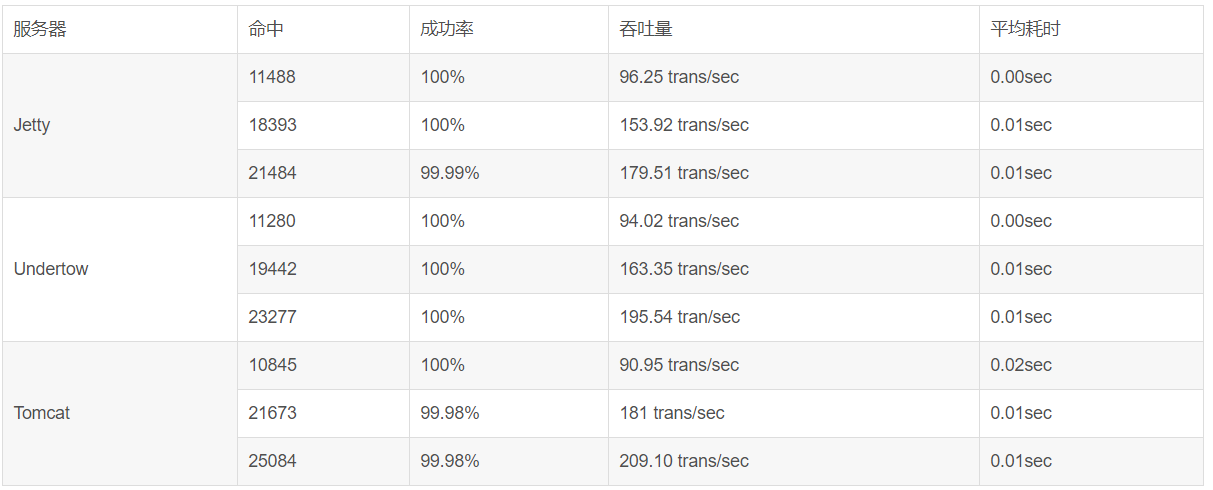 从中可以看出在高负载下Undertow的吞吐量高于Jetty而且随着压力增大Jetty和Undertow成功率差距会拉大。而在负载不是太大情况下服务器处理能力差不多,jetty还略微高于Undertow。而tomcat的负载能力似乎和Undertow很接近。