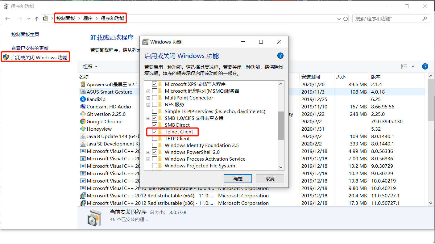 某些Windows电脑在执行命令时显示telnet命令不存在,这时需要手动安装。请先用搜索功能搜索到控制面板,然后在程序中点击程序和功能,在弹出的窗口左侧有启用或关闭Windows功能,打开里面的Telnet,点击确定即可开始安装。