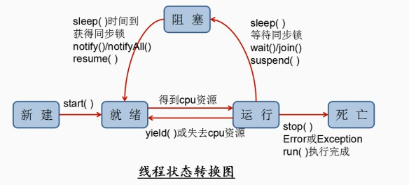 当线程启动(start)后,线程就会从出生状态到就绪状态。每个线程只能被start一次。
