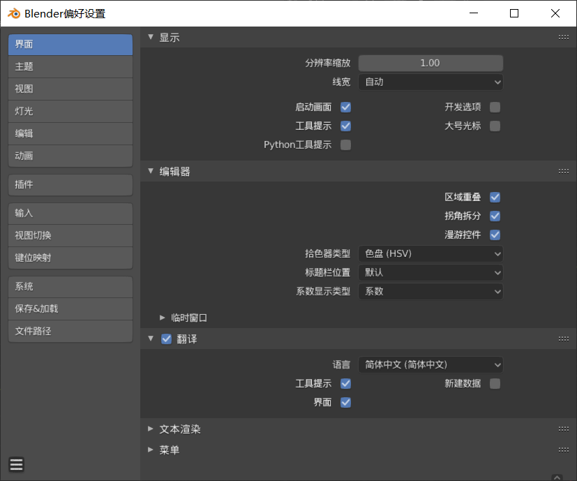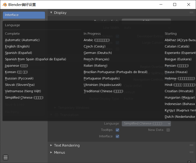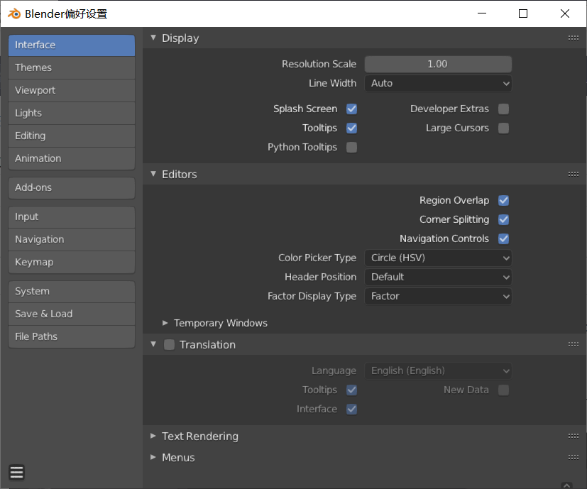 打开软件界面。依次打开Edit - Preferences - Interface - Translation 并勾选,再次勾选Interface和Tooltips。New Data 不推荐勾选。 未勾选前如图所示。注意本文已设置中文。 设置完毕如图所示。 错误设置中文等字符显示乱码。如图所示。 来源:oschina链接:https://my.oschina.net/u/1011130/blog/3171650 标签 blender