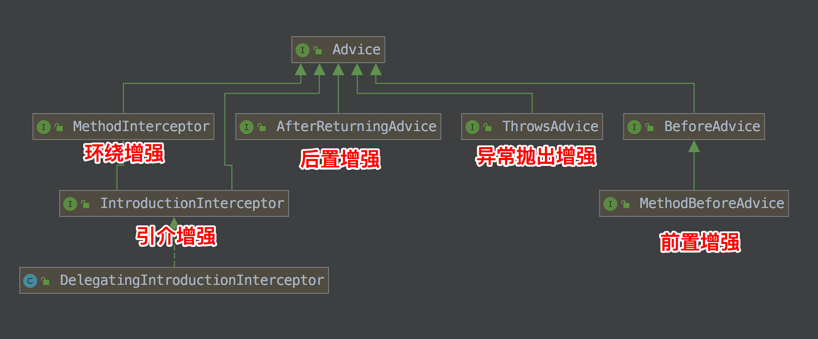 AOP联盟为增强定义了org.aopalliance.aop.Advice接口,Spring支持5种类型的增强。以下显示用到的@Before、@After等注解是基于AspectJ实现的增强类型。其实Spring也支持很多增强类型,Spring AOP按照增强在目标类方法中的连接点位置可以分为5种。