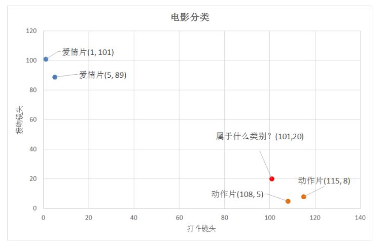 假设我们对电影进行分类,选取两个因素作为其分类依据,如图所示: