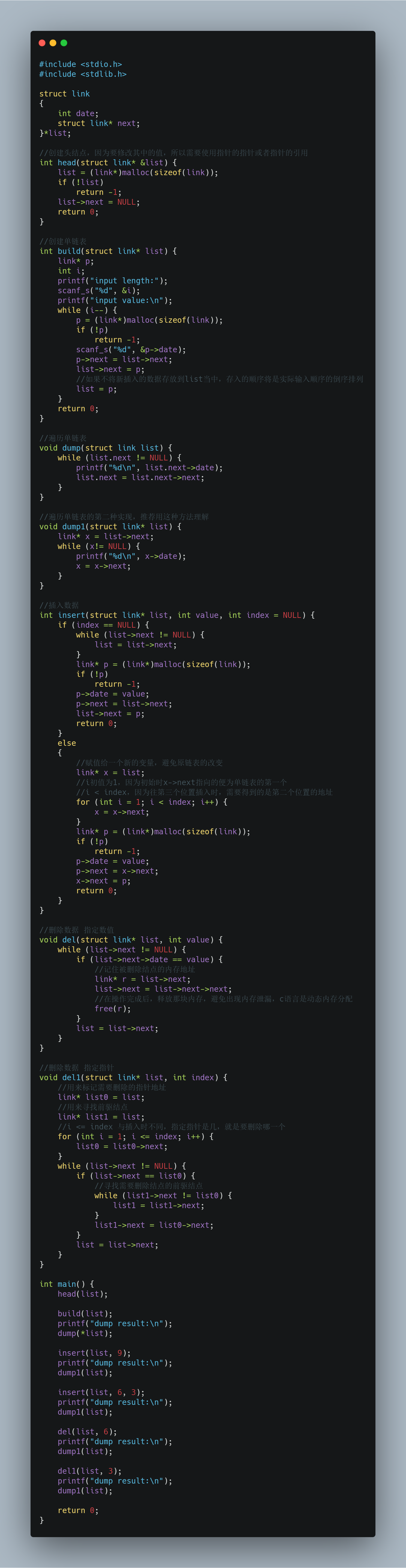 常用的链表有单链表、双向链表和循环链表,这次只完成了单链表的c语言实现,在写代码中所遇到的问题在代码注释中也都有标注,在实现上最关键的还是对整体结构的理解,只有对整体结构有一定的了解,才能在具体的代码实现中少走很多的弯路,在具体的代码实现过程中,要着重关注每一个变量的内容和具体的含义,只有搞清楚了这一点才能在实现的时候不出现一些莫名其妙的问题。