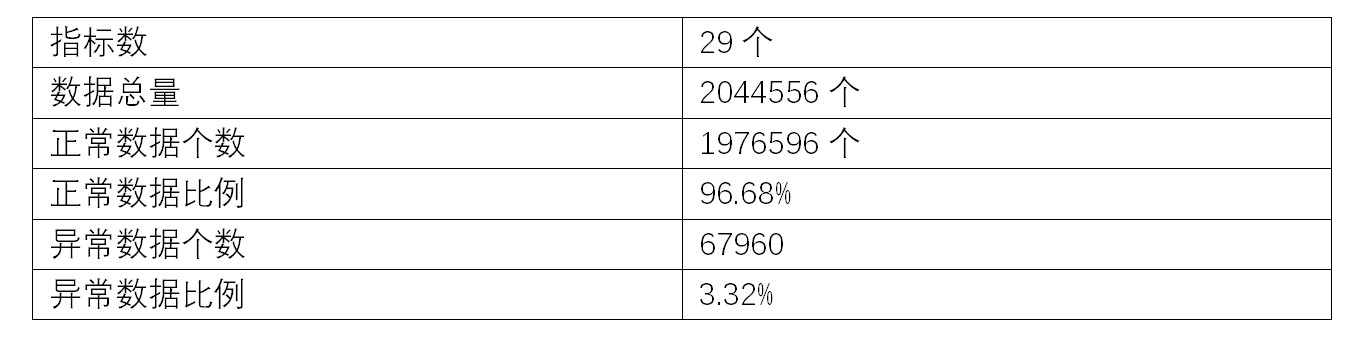 因为需要最终通过统计误报率和漏报率等指标来衡量算法的优劣,所以必须要用打标数据,因此本次实验选用清华打标数据,数据包括29个指标,每个指标3个月的数据.数据介绍见下表: