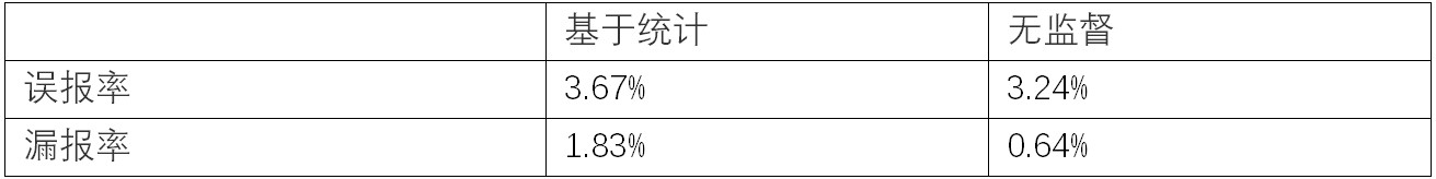 总的来说,无监督异常检测算法在漏报和误报上都比基于统计异常检测表现优秀, 尤其是误报率有大幅的领先. 证明无监督异常检测确实比基于统计异常检测更加准确有效.