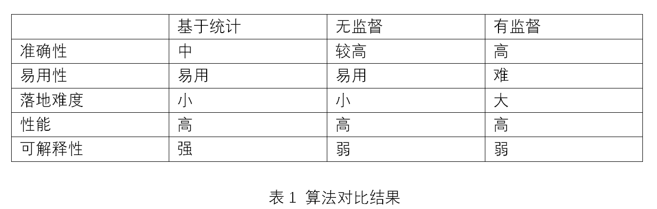 大量应用场景对快速有效检测异常的需求以及异常检测场景相较于其他场景的特殊性,使得异常检测问题的研究具有极大的应用和研究价值,促使很多异常检测算法被提出和实践.智能化的异常检测算法主要分为三大类,基于统计的异常检测算法、无监督异常检测算法和有监督异常检测算法.下面对三种检测算法作简要介绍和对比分析