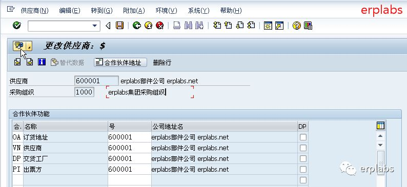 在XK03显示界面,点菜单转到—采购组织数据—合作伙伴职能,如上图示,已加入DP交货工厂,保存。