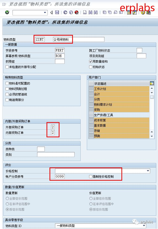 复制ROH原材料,物料类型输入ZINT 公司间物料(整机公司是原材料,部件公司是成品),物料视图须选中采购和工作计划,价格控制设置为空,帐户分类参考输入自定义的0099公司间物料参考,其它如图设置,保存。