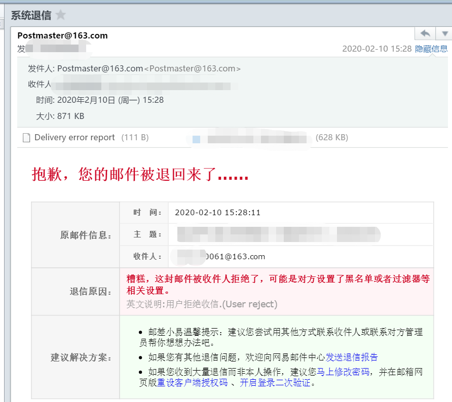 三、如何判断发送失败的邮件 由于查询了好久没有方法可以直接判断邮件发送状态所以我只能用我所遇到的退信格式来判断了,如下图(不同收件邮箱退信格式不同,渣浪的邮箱投递不成功没有退信)