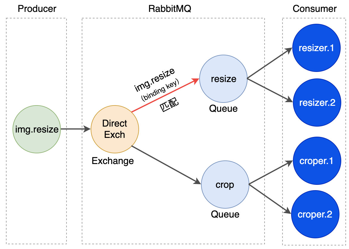 当消息到达 exchange(桔色球)后,exchange 会查找所有带着 img.resize 这个 Binding key 的 queue。