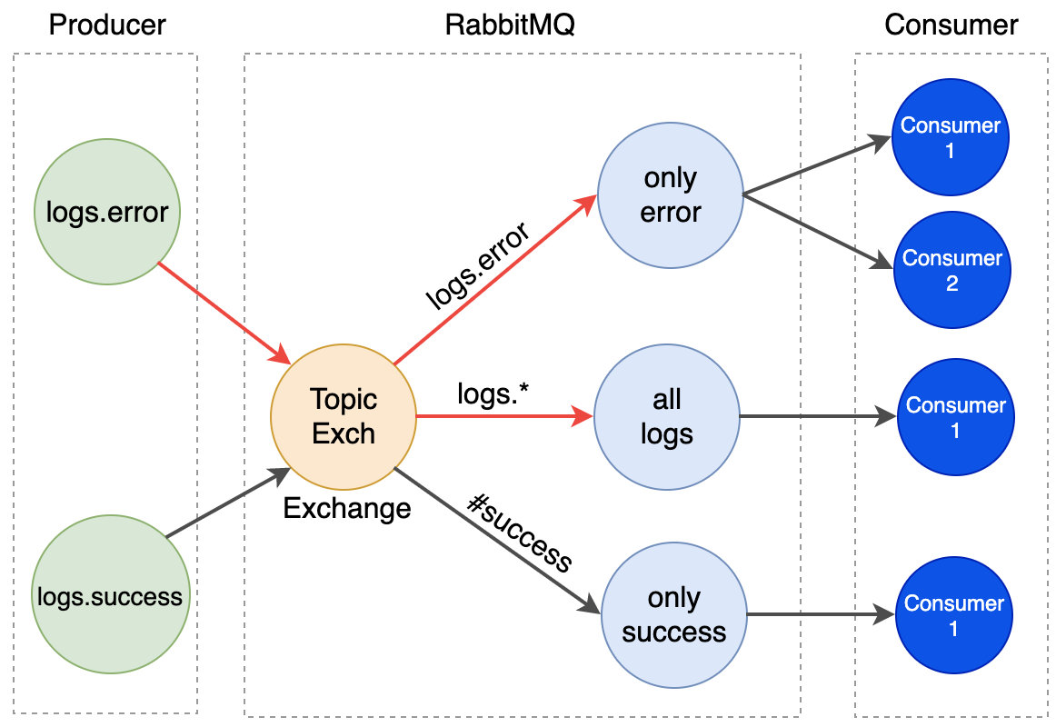 routing key 为 logs.success 的消息,匹配binding key -- #success 和 logs.*,所以消息会进入 "only success" 和 "alllogs"。