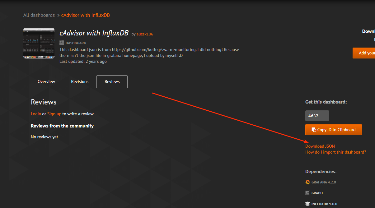 - 首先打开grafana的dashboard市场下载模版https://grafana.com/grafana/dashboards/4637/reviews