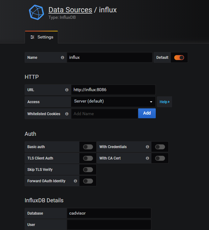 influx,因为待会要用到一个grafana模版,所以这里叫influx名字,URL填http://influx:8086,这个也不是固定的,本次docker-compose-monitor.yml文件内influxdb的容器名叫influx,端口开放出来的为8086(默认),所以这里填influx:8086