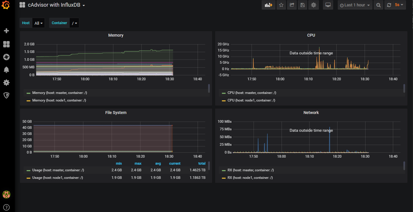 到目前为止,服务已经部署完成了,三台机器各自部署一个cadvisor,在master节点部署了grafana和influxdb