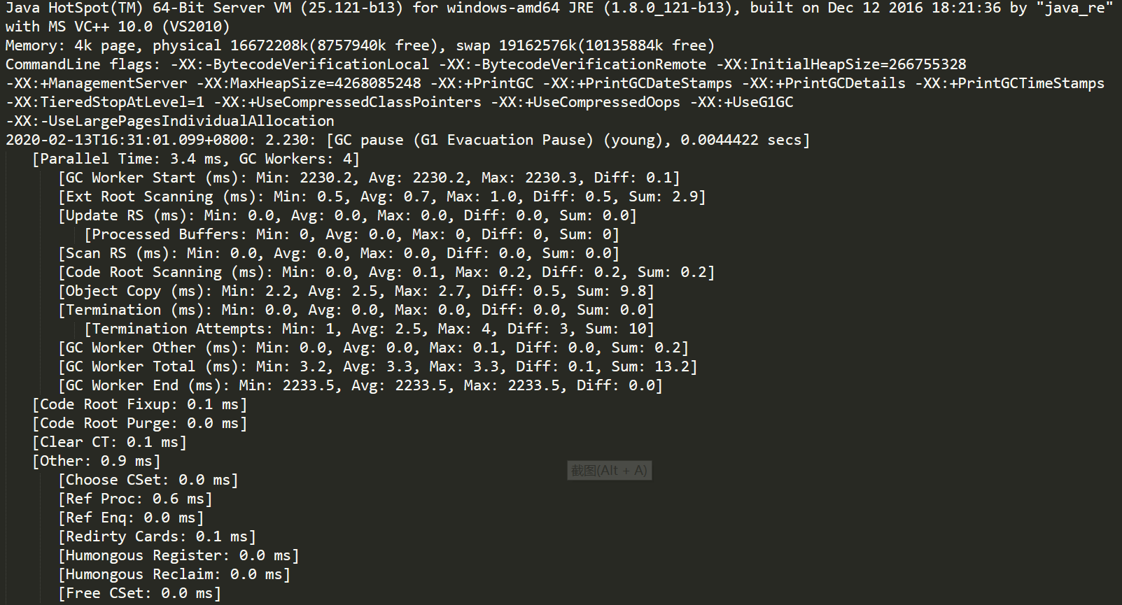 2020-02-13T16:31:01.099+0800: 2.230: [GC pause (G1 Evacuation Pause) (young), 0.0044422 secs]