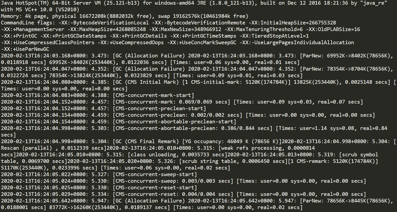 参数设置:-XX:+UseConcMarkSweepGC -Xloggc:cms-gc.log