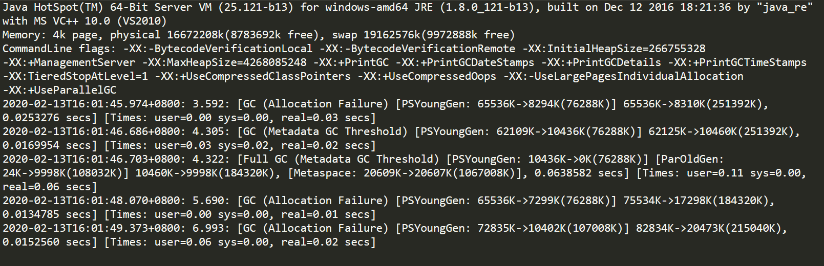 2020-02-13T16:01:45.974+0800: 3.592: [GC (Allocation Failure) [PSYoungGen: 65536K【Young区回收前】->8294K【Young区回收后】(76288K【Young区总大小】)] 65536K【整个堆回收前】->8310K【整个堆回收后】(251392K【整个堆总大小】), 0.0253276 secs] [Times: user=0.00 sys=0.00, real=0.03 secs]