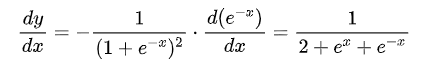从上面的函数曲线可以看出,当x为较大的正数的时候,Sigmoid函数数值非常接近于1,函数曲线变得很平滑,在这些区域Sigmoid函数的导数接近于零。当x为较小的负数的时候,Sigmoid函数值非常接近于0,函数曲线也很平滑,在这些区域Sigmoid函数的导数也接近于0。只有当x的取值在0附近时,Sigmoid函数的导数才比较大。可以对Sigmoid函数求导数,结果如下所示: