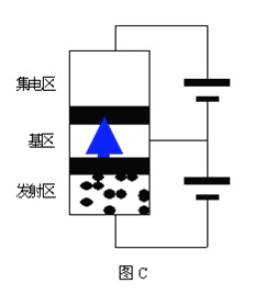 图C所示其实就是NPN型晶体三极管的雏形,其相应各部分的名称以及功能与三极管完全相同。为方便讨论,以下我们对图C中所示的各个部分的名称直接采用与三极管相应的名称(如“发射结”,“集电极”等)。再看示意图C,图中最下面的发射区N型半导体内电子作为多数载流子大量存在,而且,如图C中所示,要将发射区的电子注入或者说是发射到P区(基区)是很容易的,只要使发射结正偏即可。具体说就是在基极与发射极之间加上一个足够的正向的门电压(约为0.7伏)就可以了。在外加门电压作用下,发射区的电子就会很容易地被发射注入到基区,这样就实现对基区少数载流子“电子”在数量上的改变。