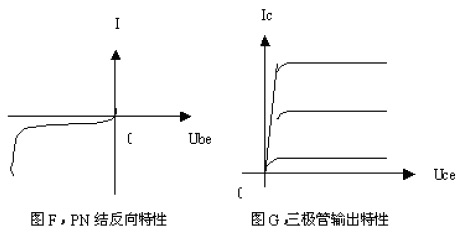 以上,我们用了一种新的切入角度,对三极管的原理在讲解方法上进行了探讨。特别是对晶体三极管放大状态下,集电结为什么会反向导电形成集电极电流做了重点讨论,同时,对三极管的电流放大倍数为什么是定值也做了深入分析。这种讲解方法的关键,在于强调二极管与三极管在原理上的联系。其实,从二极管PN的反向截止特性曲线上很容易看出,只要将这个特性曲线转过180度,如图F所示,它的情形与三极管的输出特性非常相似,三极管输出特性如图G所示。这说明了二极管与三极管在原理上存在着很必然的联系。所以,在讲解方法上选择这样的切入点,从PN结的偏状态入手讲三极管,就显得非常合适。而且,这样的讲解会使问题变得浅显易懂生动形象,前后内容之间自然和谐顺理成章。