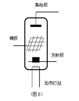 通过上面的讨论,现在已经明白,三极管在电流放大状态下,内部的主要电流就是由载流子电子由发射区经基区再到集电区贯穿三极管所形成。也就是贯穿三极管的电流Ic主要是电子流。这种贯穿的电子流与历史上的电子三极管非常类似。如图E,图E就是电子三极管的原理示意图。电子三极管的电流放大原理因为其结构的直观形象,可以很自然得到解释。