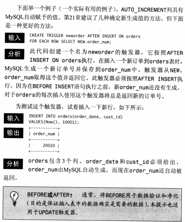 - 对于AUTO_INCREMENT列,NEW在INSERT执行前包含0,在INSERT执行之后包含新的自动生成值