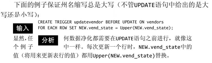 - 在BEFORE UPDATE触发器中,NEW中的值可能也被更新(允许更改将要用于UPDATE语句中的值)