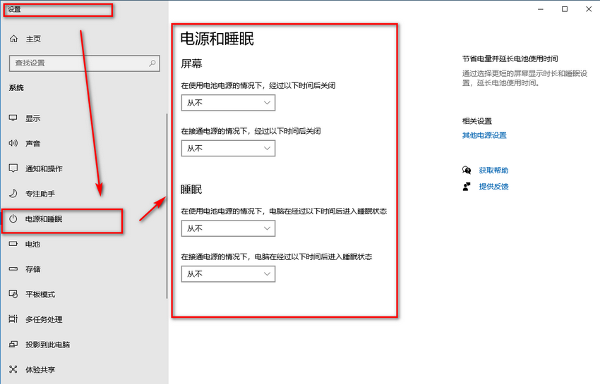 1.修改,进入主页- 电源和睡眠 ,把4项设置修改为从不。