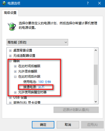 在 - 睡眠 - 在此时间后休眠 - 接通电源 - 设置为0,确定即可。